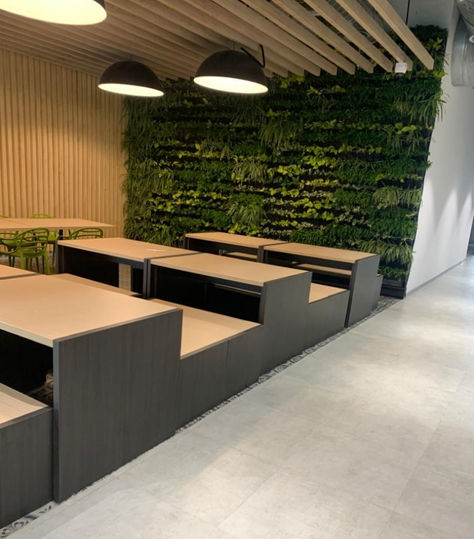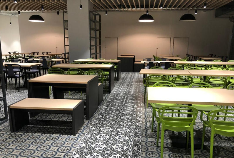 Seating 600 persons capacity, this food court which is a part of a bigger multi-use complex was designed in a minimalistic style. Contemporary design with a touch of the Indian traditional motifs set the theme for the interior space. Keeping the background palette simple, these motifs were used in the flooring, partitions and light filtering elements along the ceiling to give a complementary output.